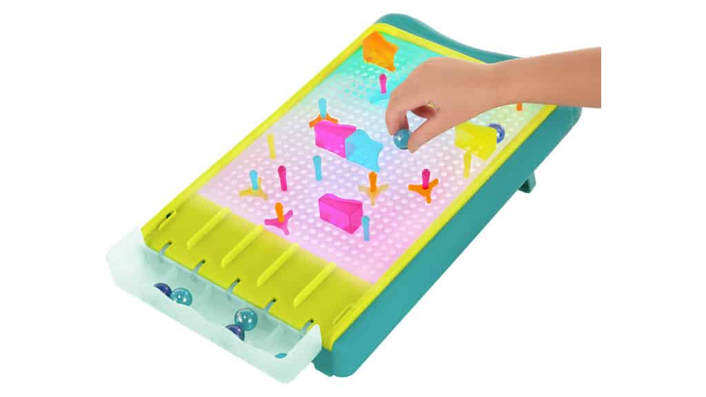 Das B. Toys leuchtende Murmeltropfen - Murmelbahn-Set kombiniert ein aufregendes Arcade-Spiel mit einer kreativen Neon-Kunstleinwand. Dieses All-in-One-Spiel verspricht stundenlange bewusste Unterhaltung, da es Kreativität und Geschicklichkeit vereint. Die Kinder können bunte, einzigartige Teile verwenden, um ihr eigenes Murmelbahn-Labyrinth zu bauen. Während die Murmel durch das Labyrinth rollt, fällt sie in einen Auffangbereich am Ende, wo jeder Abschnitt unterschiedliche Punktwerte darstellt. Wie viele Punkte wirst du mit deiner selbstgebauten Murmelbahn erzielen?