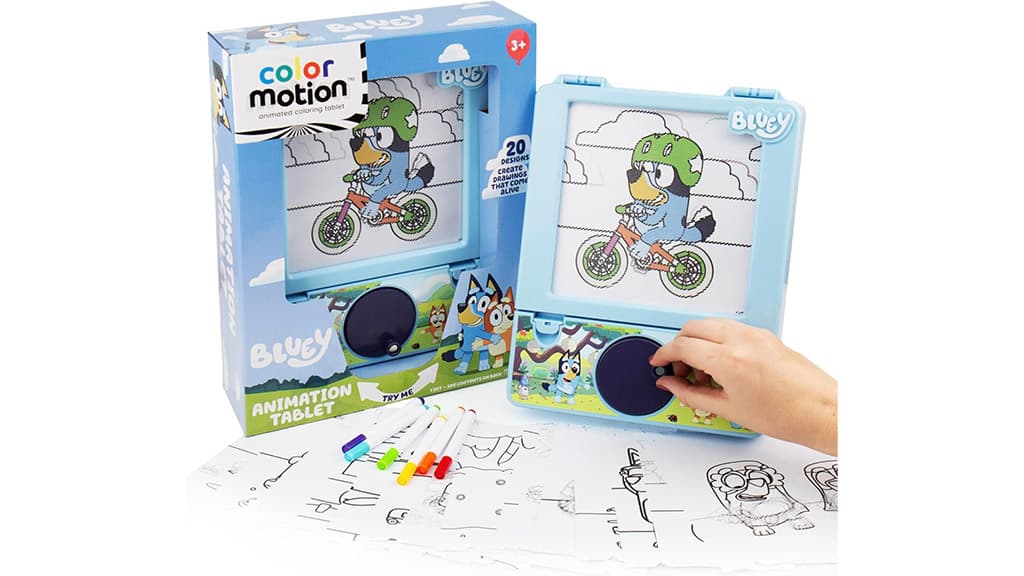 Die Kinder können 20 verschiedene Bluey- oder Hello Kitty-Szenen mit den beiliegenden Filzstiften und Schablonen ausmalen. Anschließend können sie mit der drehbaren Scheibe des Tablets ihre Kunstwerke zum Leben erwecken und Bewegung in die Bilder bringen. Dieses kreative Spiel fördert die Feinmotorik, regt die Fantasie an und bietet den Kindern stundenlangen Spaß.