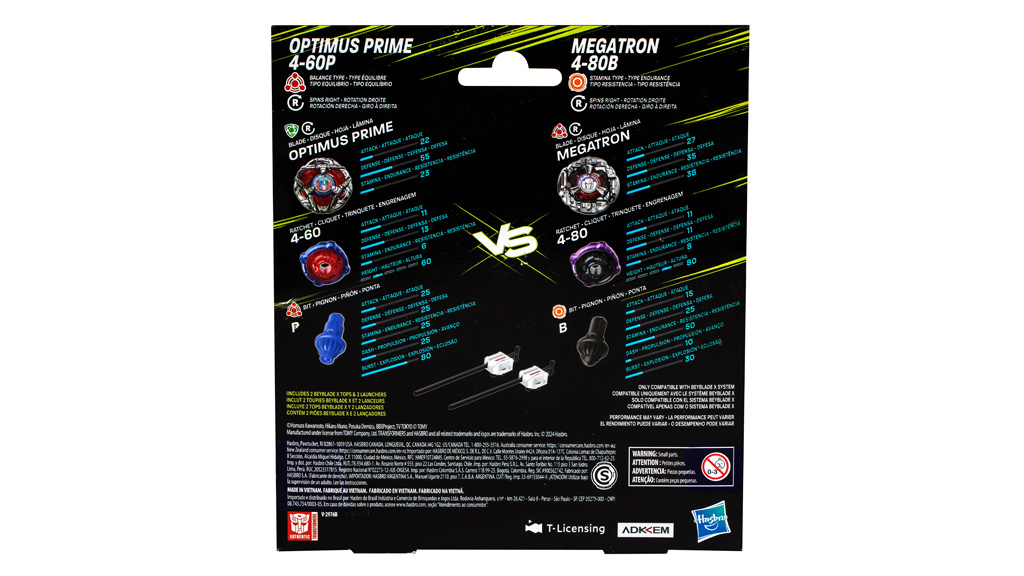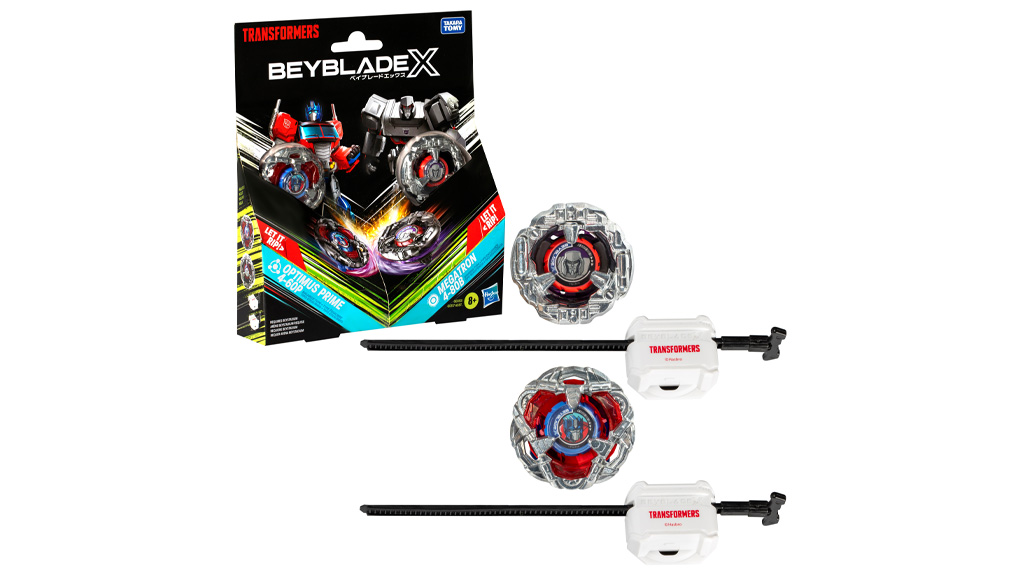 Zwei Multipack-Sets stehen zur Verfügung — das BEYBLADE x Transformers Optimus Primal 3-60F vs. Starscream 3-80N Multipack Set und das BEYBLADE x Transformers Optimus Prime 4-60P vs. Megatron 4-80B Multipack Set — mit denen die Kinder ihre Schlachten erweitern können.