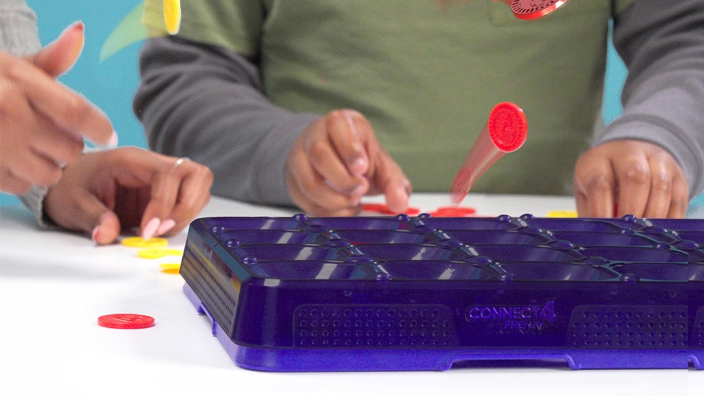 Anstatt dass die Spieler nacheinander die Scheiben einwerfen, spielt jeder gleichzeitig: Die Scheiben müssen vom Tisch aus zurückgeschnippt in das horizontale Gitter befördert werden, mit dem Ziel, vier nebeneinander zu platzieren. So ist das Spiel viel schneller und spannender, da alle gleichzeitig versuchen zu gewinnen und dabei auch auf die Züge der anderen achten müssen. Strategie und Schnelligkeit sind in dieser Variante gleichermaßen wichtig.