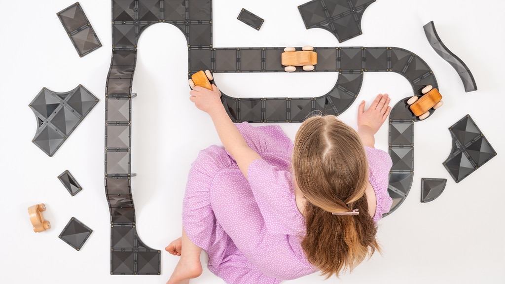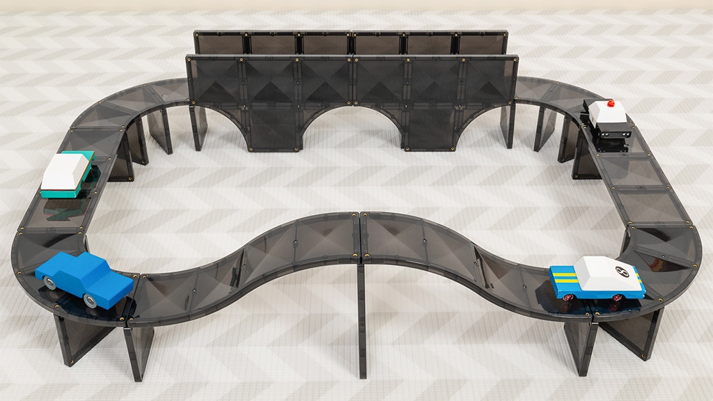 Dieses Set präsentiert die schlichten schwarzen Fliesen und die neuen Fliesenformen in der Connetix-Kollektion. Inspiriert von echten Straßen, setzen diese neuen magnetischen Fliesen die Fantasie der Kinder auf den Fahrersitz, während sie einzigartige Wege für jedes Spielzeugauto schaffen. Neben den traditionellen quadratischen Fliesen enthält das Set auch Bögen, Kreuzungen, Viertelkreise, lange Rampen und kurze Rampen. Die Kinder können alle 48 Teile nutzen, um ihre eigenen einzigartigen Flughäfen, Skateparks, Städte und vieles mehr zu entwerfen.