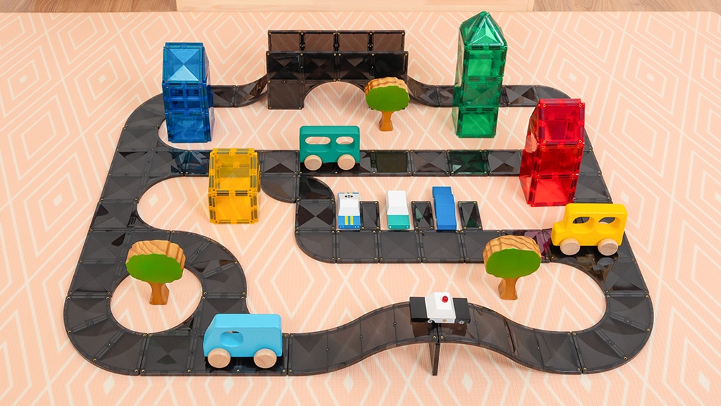 Das Set enthält keine Autos, da es das Ziel der Kinder ist, mit jedem Auto zu spielen, das sie bereits besitzen, oder ein eigenes Auto mit zusätzlichen Connetix-Sets zu bauen. Das Set funktioniert gut mit allen anderen Connetix-Sets, und das Hinzufügen eines Pastell- oder Regenbogensets kann die Straßen wirklich auf ein neues Niveau heben, indem es das Rollenspielerlebnis mit bunten und fröhlichen Dekorationen erweitert.Kreative Kinder; Kleine, die Autos, Züge und Flugzeuge lieben; Kinder, die bereits ein Connetix-Set haben.