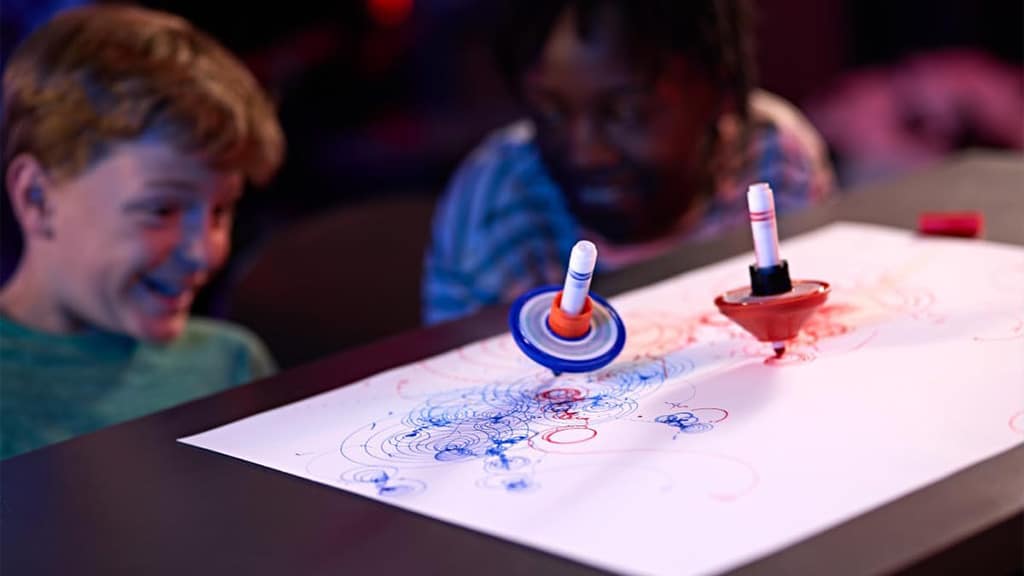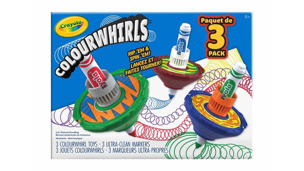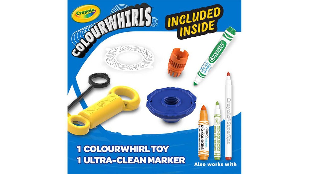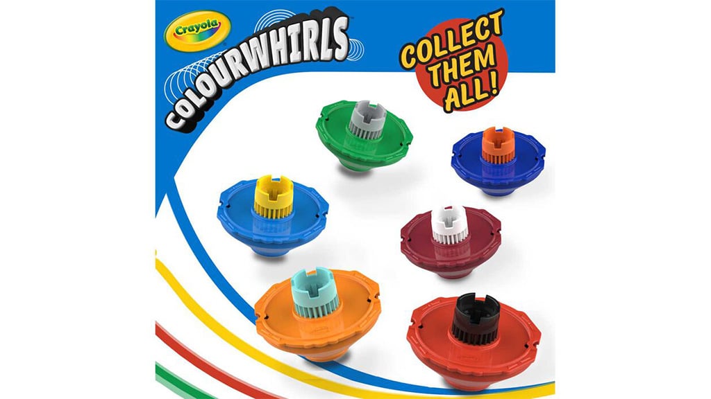 Kinder können mit Hilfe von Crayola Colourwhirls bunte Spiral-Kunstwerke erstellen. Dieses "Bastelset" kombiniert das klassische Kreiselspiel mit den auswaschbaren Filzstiften der Marke und bietet so eine neue Möglichkeit zum Spielen und Gestalten. Nachdem der Filzstift in den Kreisel eingesetzt wurde, können die Kinder mit Hilfe des Griffs und der Zugleine die Kreisel drehen und Spiral-Kunstwerke schaffen. Colourwhirls sind einzeln und im Dreierset erhältlich und kompatibel mit anderen Crayola-Produkten, einschließlich dicker und dünner Filzstifte, Pip-Squeaks und Super Tips.