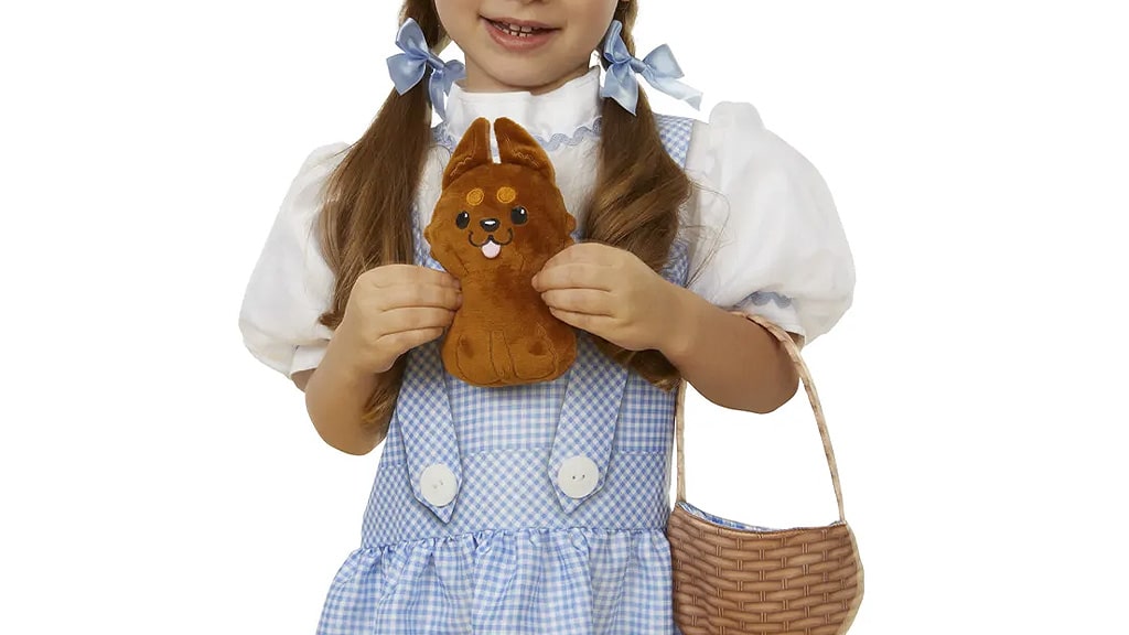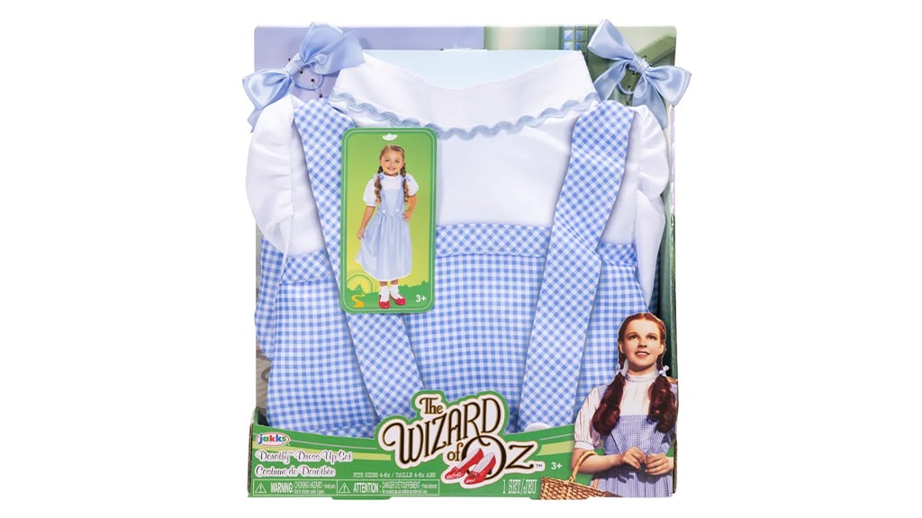 Die Kinder können die Smaragdstadt entdecken oder neue, spannende Spielabenteuer erleben, indem sie sich als Dorothy verkleiden. Das Dorothy Kostüm-Set enthält eine blau-weiß karierte Schürzenkleid-Nachbildung sowie passende Haarbänder. Das Dorothy Zubehör-Set vervollständigt das Outfit: mit einem Paar rubinroten Schuhen, einem Korb und einem Toto Plüschhund.
