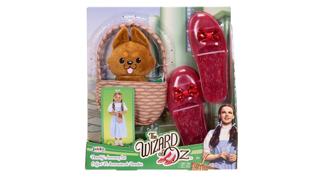 Die Rubin-Pantoffeln mit ihrem glitzernden Aussehen können zum Lieblingsstück jedes Kindes werden, der Korb ist praktisch und stilvoll, während der Toto-Plüsch ein weicher und kuscheliger Begleiter für die Abenteuer ist.