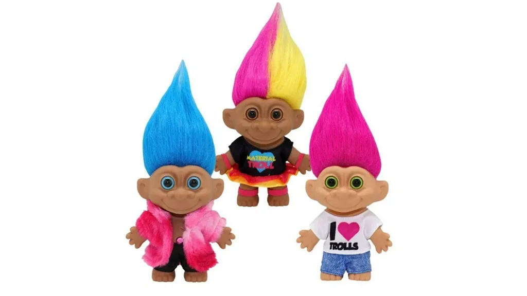 Es gibt zwei Möglichkeiten, um an diese neuen Glückstrolle zu gelangen. Die für Kinder ab 5 Jahren entworfenen 4-Zoll-Trollpuppen sind in drei verschiedenen Ausführungen erhältlich — Material Troll, I Heart Troll und Rockstar Troll. Der Material Troll hat rosa-gelbes Haar, trägt ein schwarzes T-Shirt mit der Aufschrift „Material Troll“ und einen rot-gelben Rock. Der I Heart Troll hat leuchtend rosa Haare, trägt ein weißes I Heart Trolls T-Shirt und Jeans. Der Rockstar Troll hat leuchtend blaues Haar und Augen und trägt einen rosa Pelzmantel.