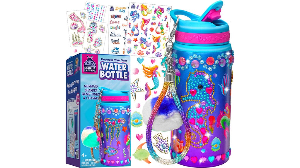 Dekoriere deine eigene Meerjungfrau-Schmuckflasche mit trendigen Meerjungfrau-Steinen, Aufklebern und Accessoires! Jedes Set enthält: 1 Aluminiumflasche (Fassungsvermögen: 591 ml), 4 Meerjungfrau-Anhänger, 1 Pompon-Anhänger, 3 Meerjungfrau-Edelstein-Aufkleberbögen, 2 Vinyl-Aufkleberbögen sowie ein glitzerndes Armband für einfaches Tragen. Dieses Set ist die neu interpretierte, moderne Version der beliebten Schmuckflasche und bietet noch mehr Möglichkeiten für kreative Dekoration und individuellen Stil. Die perfekte Wahl für alle Meerjungfrau-Fans, die gerne kreativ sind und besondere, personalisierte Accessoires lieben!
