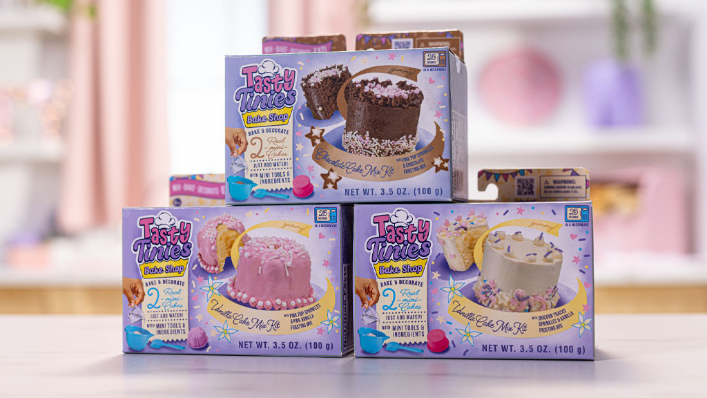 Kleine Kuchen, großer Geschmack!Goliath bringt eine neue Kollektion für kleine Bäcker heraus. Die Tasty Tinies Bake Shop Serie enthält Miniaturkuchen, die Kinder selbst backen können. Nur fünf einfache Schritte und 25 Sekunden in der Mikrowelle, und die Kinder können im Handumdrehen eine DIY süße Leckerei zubereiten!