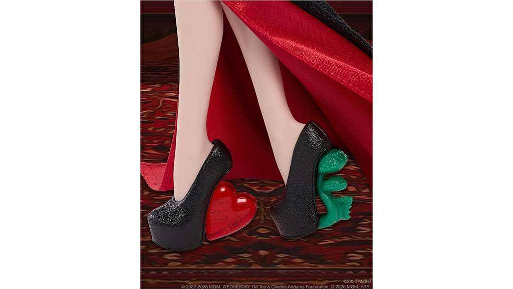 Das gespenstisch elegante Outfit wird durch ein Paar schwarze High Heels komplettiert: Auf dem einen Schuh prangt eine Venusfliegenfalle, auf dem anderen ein zerbrochenes Glassherz. Diese Puppe ist die perfekte Wahl für jeden Addams Family Fan, denn ihre detailreiche Ausarbeitung und ihr einzigartiger Stil machen sie zu einem echten Highlight in jeder Sammlung.