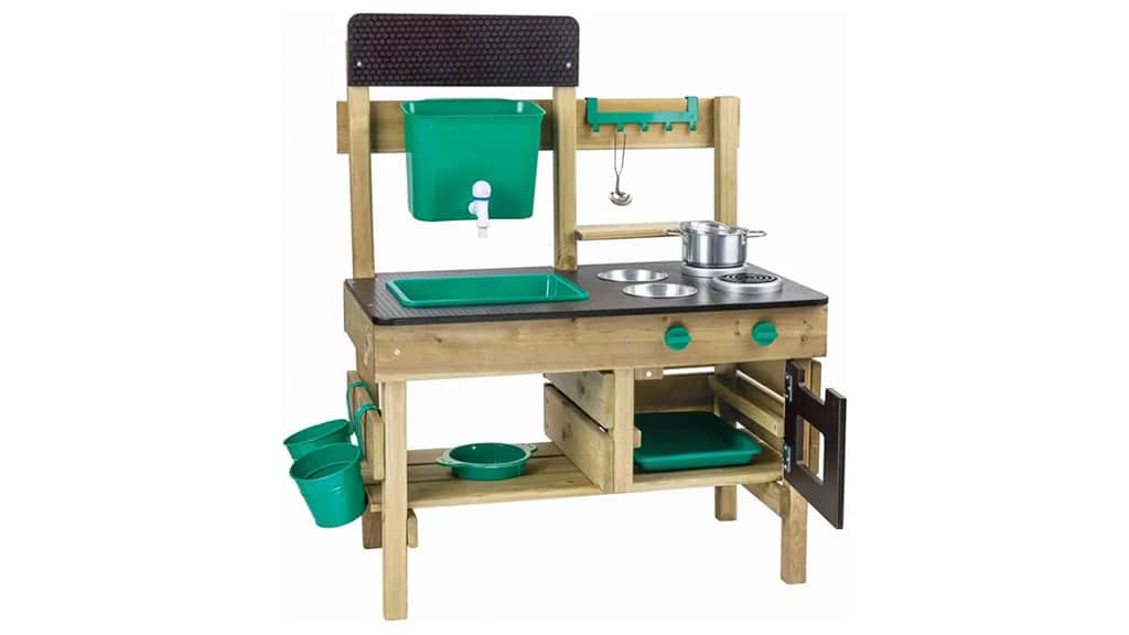 Dieses Spielset enthält alles, was Kinder brauchen, um auch im Freien Kochspiele spielen zu können. Es gibt darin Küchenzubehör, Blumentöpfe, einen Wassertank, ein Spülbecken mit funktionierendem Wasserhahn, einen Ofen und auch eine Menütafel aus Kreide. Die Fantasie der Kinder ist grenzenlos, daher ist auch die Auswahl an imaginären Speisen unendlich – sie können zum Beispiel Matschkuchen oder Steinsuppe zubereiten. Dieses Set bietet nicht nur Unterhaltung, sondern fördert auch die kreative Entwicklung und das Rollenspiel, während die Kinder gemeinsam an der frischen Luft spielen.