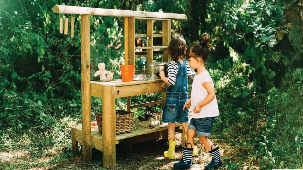 Diese Outdoor-Spielküche ist mit allem ausgestattet, was Kinder brauchen, um meisterhafte Matschkekse herzustellen. Sie verfügt über einen 2-Liter-Wassertank, einen funktionierenden Wasserhahn, Edelstahltöpfe sowie eine Mini-Gießkanne. Unter dem Herd verbirgt sich ein sensorischer Behälter, der noch mehr Möglichkeiten zum Mischen, Matschen und Planschen bietet. Auch das Aufräumen macht Spaß, denn der doppelstöckige Stauraum ist mit Haken versehen, sodass jedes Utensil seinen Platz hat und das Ordnung schaffen zu einem spielerischen Erlebnis wird.