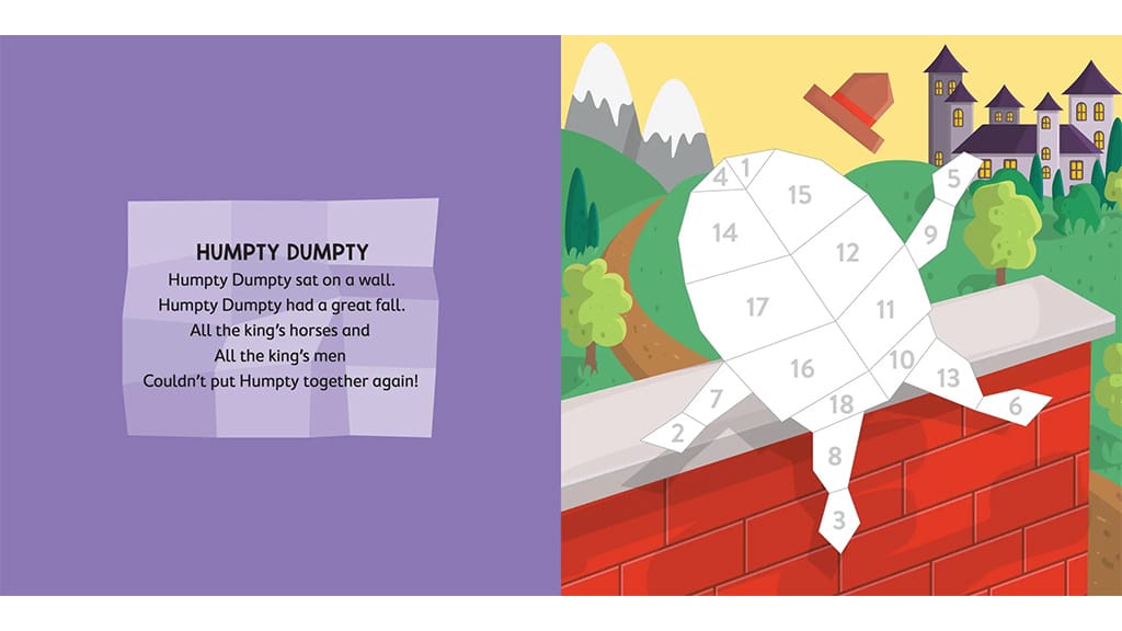 Die Gutenachtgeschichten werden jetzt durch Tagesaktivitäten mit Hilfe des Nursery Rhymes Stickerbuchs ergänzt. Die Kinder können die Szenen aus klassischen Geschichten wie „Humpty Dumpty“, „Jack and Jill“, „Hickory Dickory Dock“ und vielen anderen bekannten Reimen nachgestalten. Neben den kreativen Aktivitäten mit Aufklebern finden sich auf der Rückseite jeder Buchseite auch die Texte beliebter Kinderlieder, sodass das Lesen noch unterhaltsamer wird. Dieses Buch fördert nicht nur die Feinmotorik, sondern hilft den Kindern auch, die bekanntesten englischen Reime kennenzulernen und zu lieben, während es ein gemeinsames Erlebnis für die ganze Familie bietet.