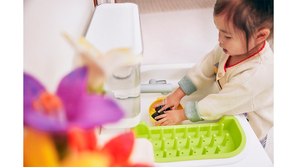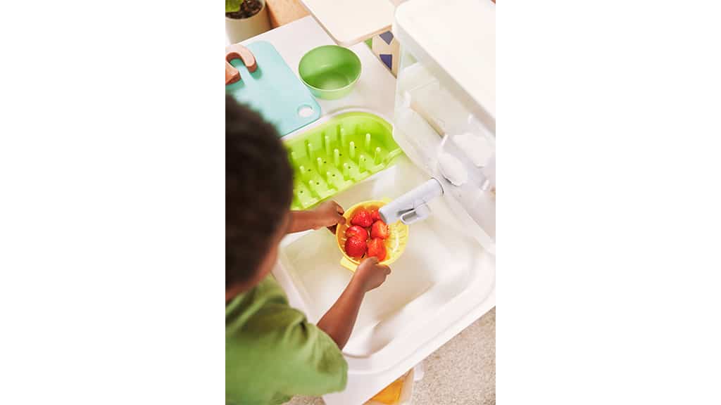 Eine der bemerkenswerten Eigenschaften ist das fließende Wasser. Die Erwachsenen können das Wasser im hinteren Teil der Spielküche auffüllen, und die Kinder können diese Funktion nutzen, so wie sie es von den Erwachsenen am großen Spülbecken sehen. Ob sie ihre eigenen Hände waschen, ihr eigenes Glas füllen oder das Spielobst abspülen, bevor sie es imaginären Gästen servieren, sie lernen die echten Funktionen der Küche kennen!