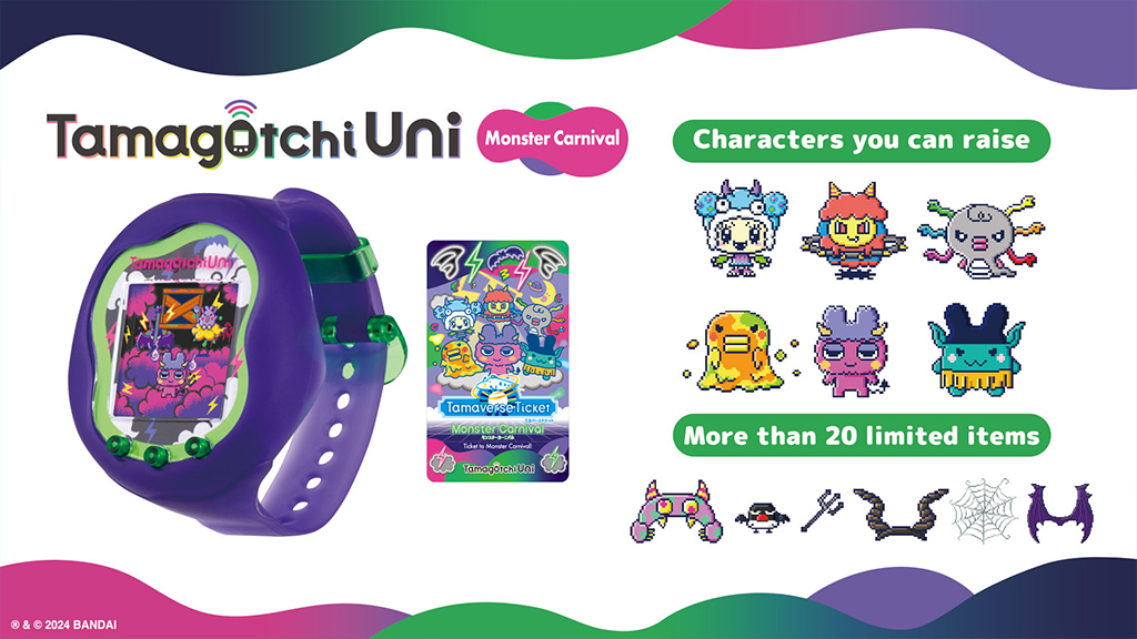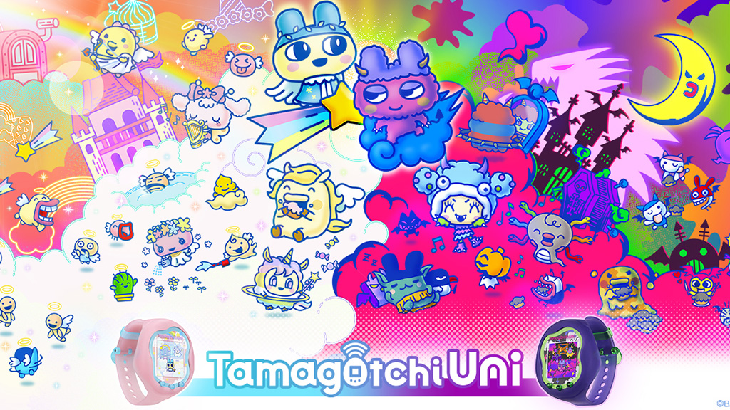Tritt ein in die Welt des Tamaverse mit der zweiten Welle der Tamagotchi Uni Geräte. Diese Kollektion enthält neue Gehäuse und Armbänder, limitierte Charaktere und Minispiele. Das Angel Festival bringt eine niedliche Atmosphäre mit einem rosa Armband und Pastellfarben. Das Monster Carnival weiß, wie man rockt, mit seinem mutigen und punkigen Design, das dunkle Lila und Neon-Grün enthält.
