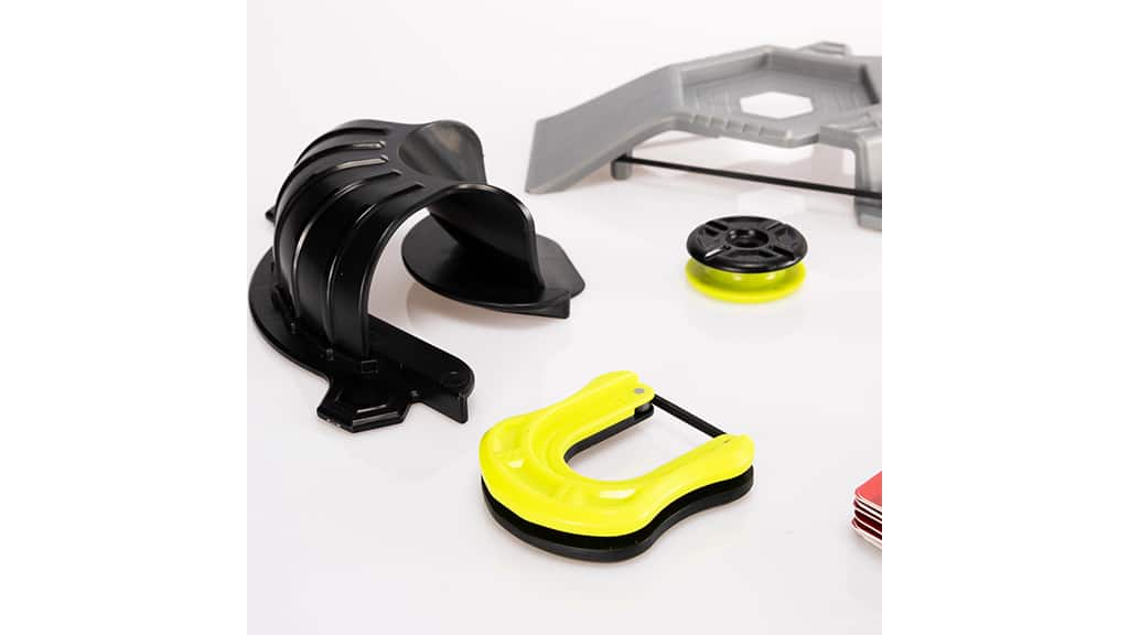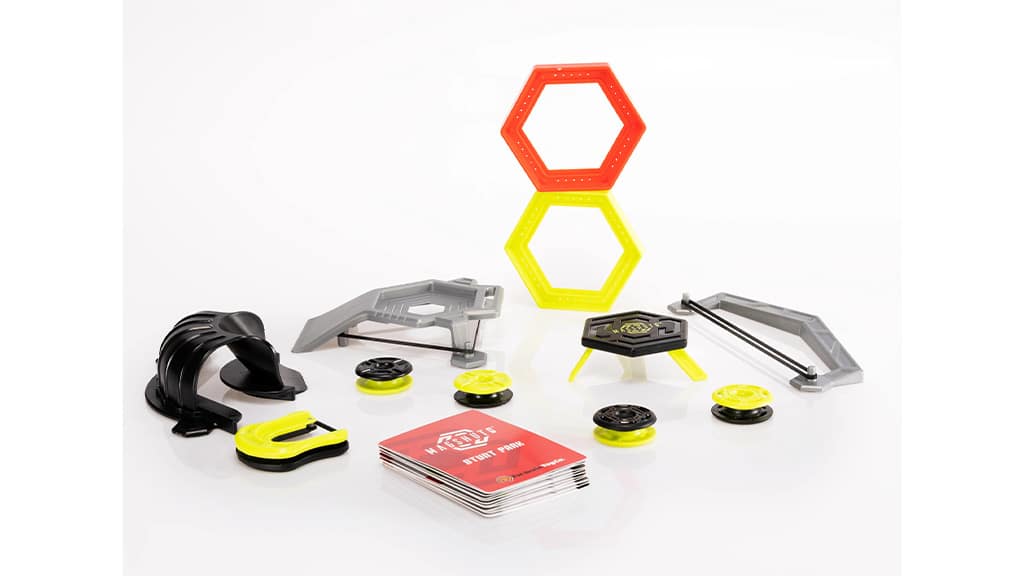 Die Zielscheiben können nach Belieben angeordnet werden, oder man kann den spannenden Ideen der beiliegenden Herausforderungskarten folgen. Einfach einen Mag-Pod in den Starter laden, mit dem Finger zurückziehen, zielen und zuschauen, wie er abgeschossen wird! Das Set enthält Rampen, Rückprall-Elemente, Ringe, einen Tunnel und ein magnetisches Ziel, sodass alles bereit ist, damit die Kinder die coolsten Stunts ausführen können.