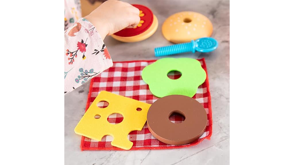 Wir lieben, dass dieses Set so viele Elemente enthält, die es für die jüngsten Köche und Hamburgerliebhaber unterhaltsam, spannend und anregend machen. Anstatt nur einen einteiligen Spielzeug-Hamburger zu bekommen, ist jede Zutat als separates Teil vorhanden, sodass die Kinder ihre eigenen Kreationen gestalten und verschiedene Variationen ausprobieren können. Coole Funktionen wie die Saucenschale, die zwischen verschiedenen Saucen wechselt, und die Hamburgerzutaten, die auf einen Holzstab gesteckt werden können, machen dieses Set unterhaltsamer und attraktiver als ein typisches Spielzeuglebensmittel-Set. Die meisten Teile sind aus Holz und Filz gefertigt, daher sind wir zuversichtlich, dass dieses Set von hoher Qualität ist und sorgfältig ausgearbeitete Details aufweist.