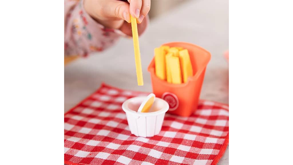 Die Kinder werden es lieben, die aus Filz gefertigten Pommes in die Saucenschale zu tauchen, die zwischen Senf und Ketchup wechselt, mit dem Pretendables Burger und Fries Set. Dieses Spiel ist nicht nur unterhaltsam, sondern fördert auch die Vorstellungskraft und die Feinmotorik der Kinder. Der Wechsel zwischen verschiedenen Saucen gibt den Kindern die Möglichkeit, sich verschiedene Geschmäcker und Texturen vorzustellen, während sie beim Spielen kreativ ihre eigene kleine Welt gestalten.