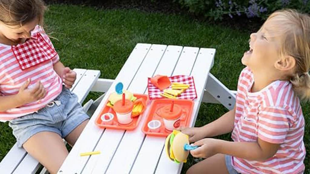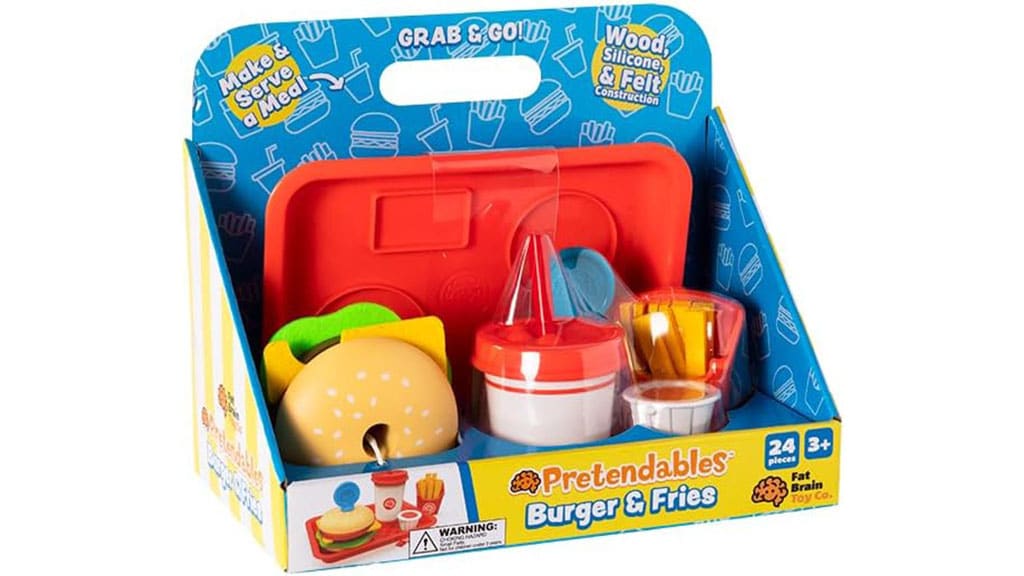 Fat Brain Toys und Pretendables erweitern das Menü mit neuen Elementen: Hamburgern und Pommes Frites. Dieses 24-teilige Set enthält alles, was Kinder brauchen, um das perfekte imaginäre Fast-Food-Stil-Hamburger-Menü zuzubereiten. Es ist mehr als ein gewöhnliches Essensset, da es voller unterhaltsamer Elemente ist, die man berühren und sehen kann. Die Filz-Pommes sind weich, und der Deckel auf dem Getränk hat drückbare Knöpfe, um nur einige zu nennen. Die Kinder werden das Spielrestaurant und die Essenszeit mit diesem interaktiven Set lieben. Hoffentlich hat die Familie Hunger!