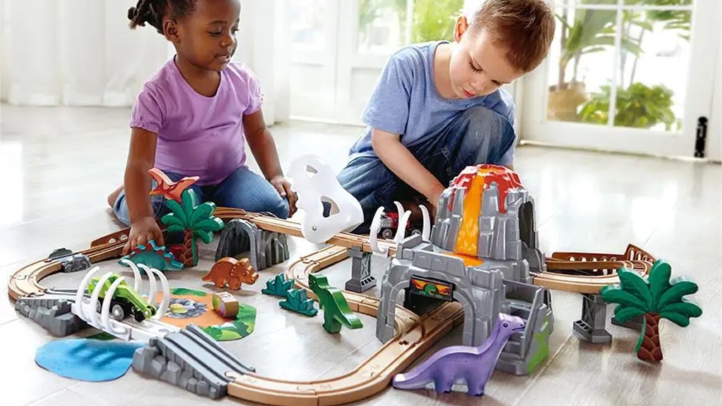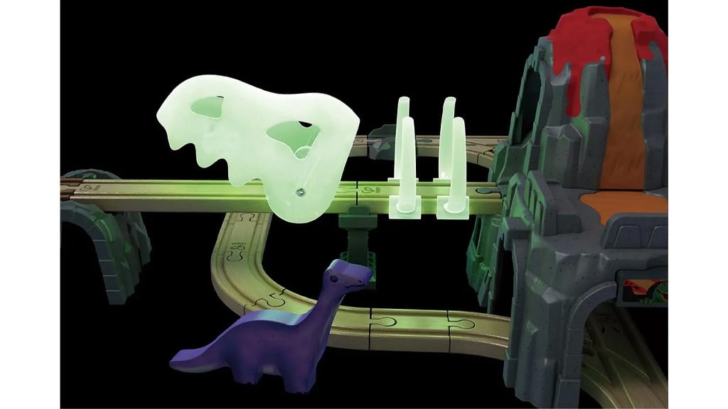 Bereite dich auf ein Jurassic-Abenteuer mit diesem Holz-Eisenbahnset vor! Das Set enthält Holz-Dinosaurier, tropische Bäume, ein Dinosaurier-Schädel-Hindernis und vieles mehr. Es ist auch mit anderen klassischen Hape-Eisenbahnsystemen kompatibel. Dieses Set ist die perfekte Wahl für Kinder, die Dinosaurier und Züge lieben, da es kreatives Spielen und die Entfaltung der Fantasie ermöglicht. Mit den verschiedenen Elementen können Kinder ihre eigenen Geschichten kreieren, während sie ihre Geschicklichkeit und Problemlösungsfähigkeiten entwickeln. Die Verwendung natürlicher Materialien stellt sicher, dass das Spielzeug umweltfreundlich und sicher für die Kleinen ist.