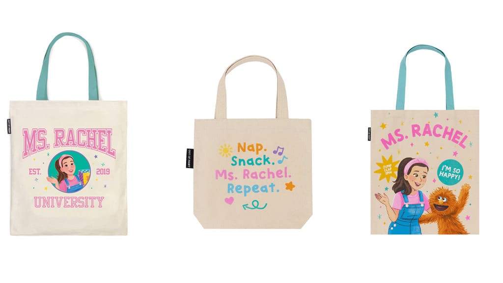 Wenn deine Familie zusammen Ms. Rachel schaut, könnt ihr auch gemeinsam eure Garderobe auffrischen! Die Out of Print Ms. Rachel Kollektion enthält T-Shirts, Babykleidung, Taschen, Kaffeetassen und vieles mehr für alle, die wirklich glücklich sind!
