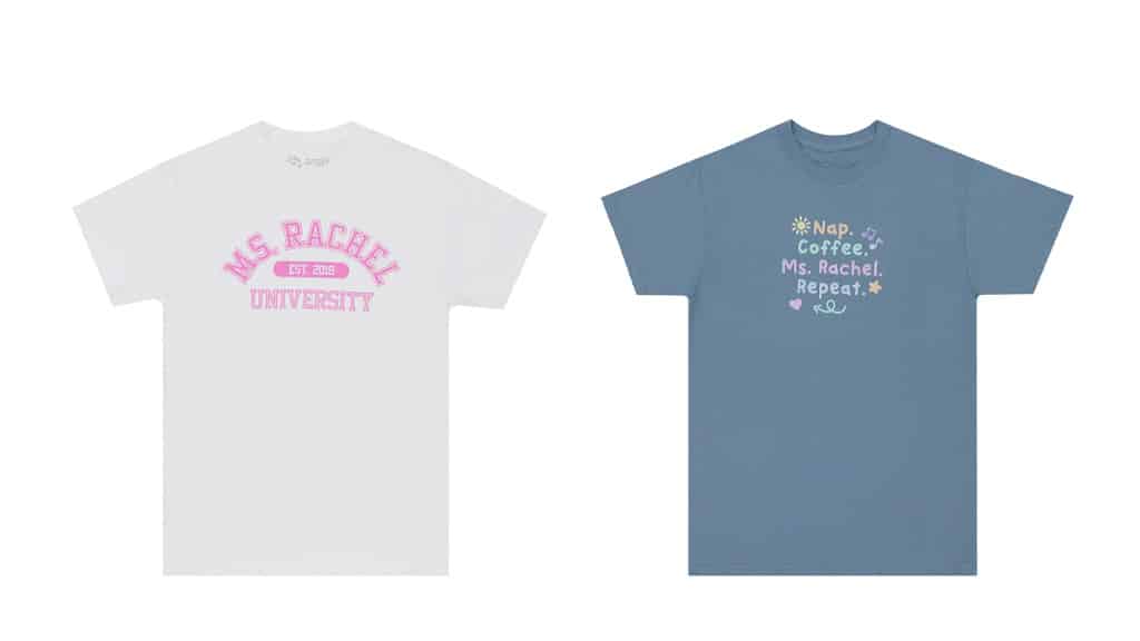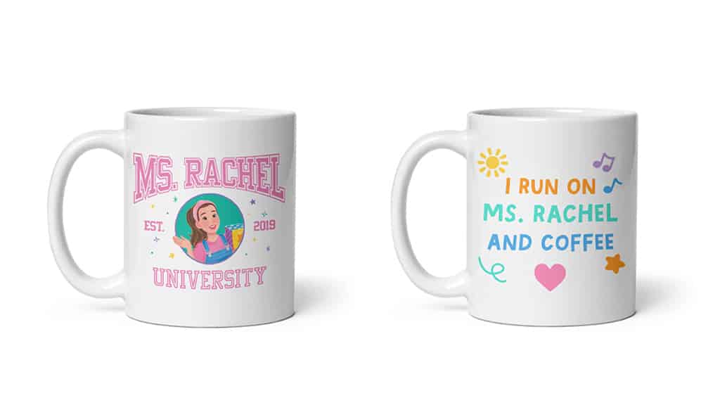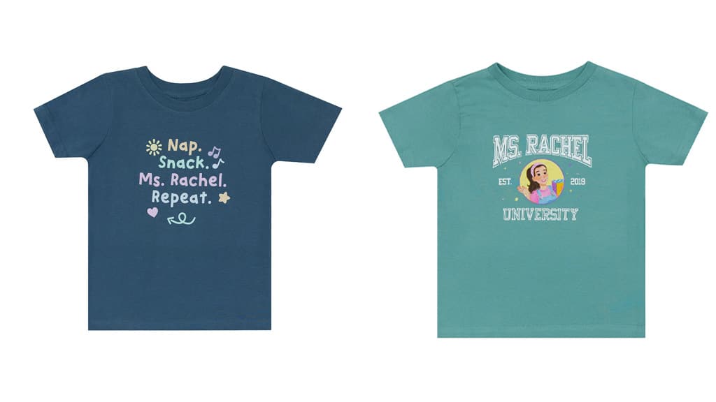 Diese Kollektion enthält Bodys, T-Shirts, Pullover, Taschen, Kaffeetassen und vieles mehr für alle Altersgruppen, die Fans von Ms. Rachel sind.