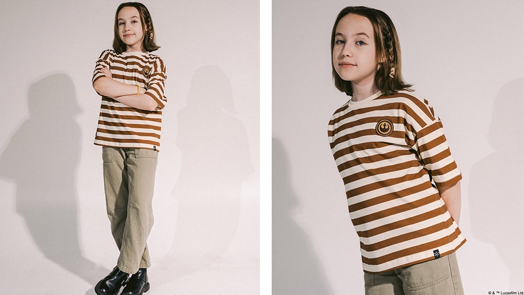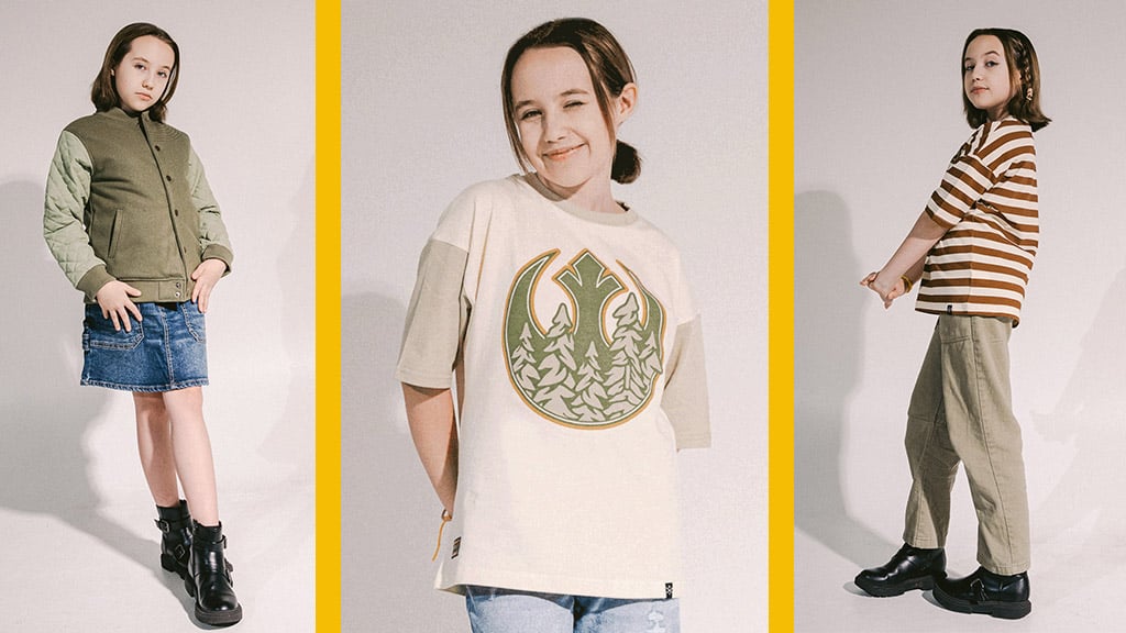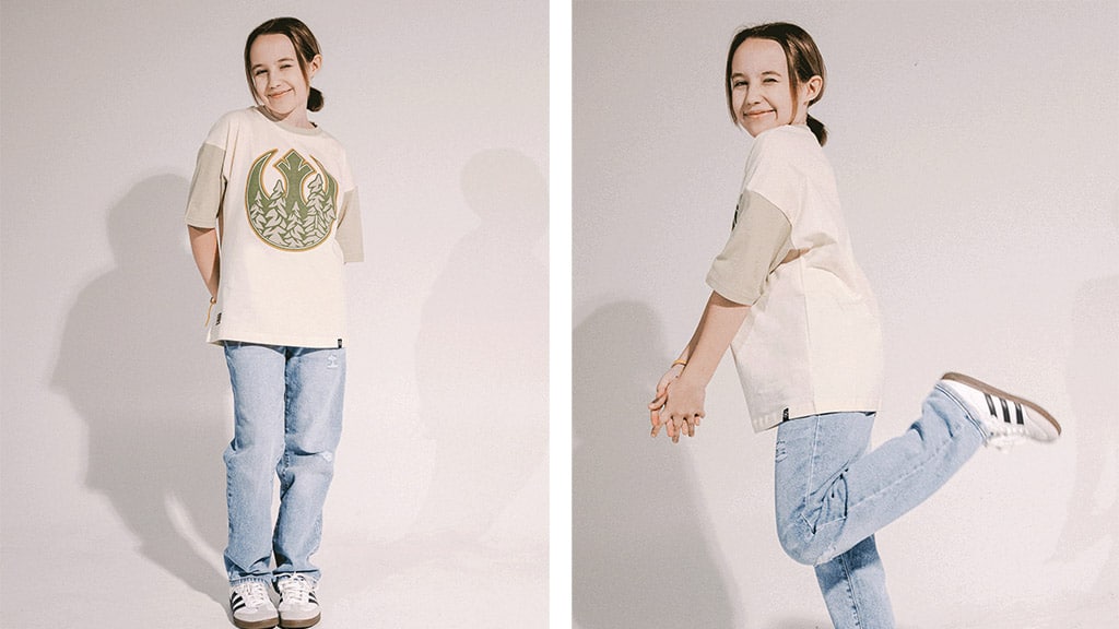 Vivien Lyra Blair hat sogar bei dem Fotoshooting ihrer eigenen Modekollektion mitgewirkt! Das zeigt, dass sie nicht nur eine talentierte Schauspielerin, sondern auch eine kreative und vielseitige Persönlichkeit ist, die gerne an der Welt der Mode teilnimmt. Während des Shootings zeigte sie ihren einzigartigen Stil und ihre Persönlichkeit, womit sie ihre Fans und Follower inspirierte. Das Besondere an der Kollektion ist, dass sie einzigartige, designte Stücke enthält, die Viviens individuellen Geschmack und ihre Kreativität widerspiegeln.Jedes einzelne Stück der Kollektion zeigt außergewöhnliche Aufmerksamkeit für Details und geht weit über die üblichen, für Kinder bestimmten Produkte hinaus! Der Rebels of Alderaan Kapuzenpullover (65 Dollar) ist vorne mit einem großen Aufnäher der Rebellenallianz und einem gestickten Alderaan-Wald-Label verziert. Der Rand und das Innere der Kapuze sind mit einer geflochtenen Naht eingefasst, die an Leias ikonische Frisur erinnert. Die Rebels of Alderaan Kinder-Bomberjacke (100 Dollar) verweist ebenfalls auf Blairs Rolle in der Obi-Wan-Serie: Gesteppten Ärmel, gerippte Abschlüsse und Knöpfe vervollständigen das Design und erinnern an die grüne Jacke, die sie im Film trägt. Diese Kleidungsstücke sind nicht nur stilvoll, sondern bieten auch Star Wars-Fans ein besonderes Erlebnis, denn in jedem Detail spiegeln sich die Welt der Geschichte und der Charaktere wider.