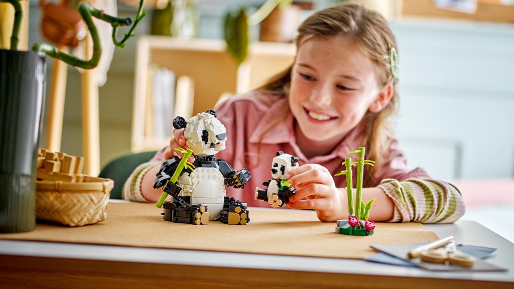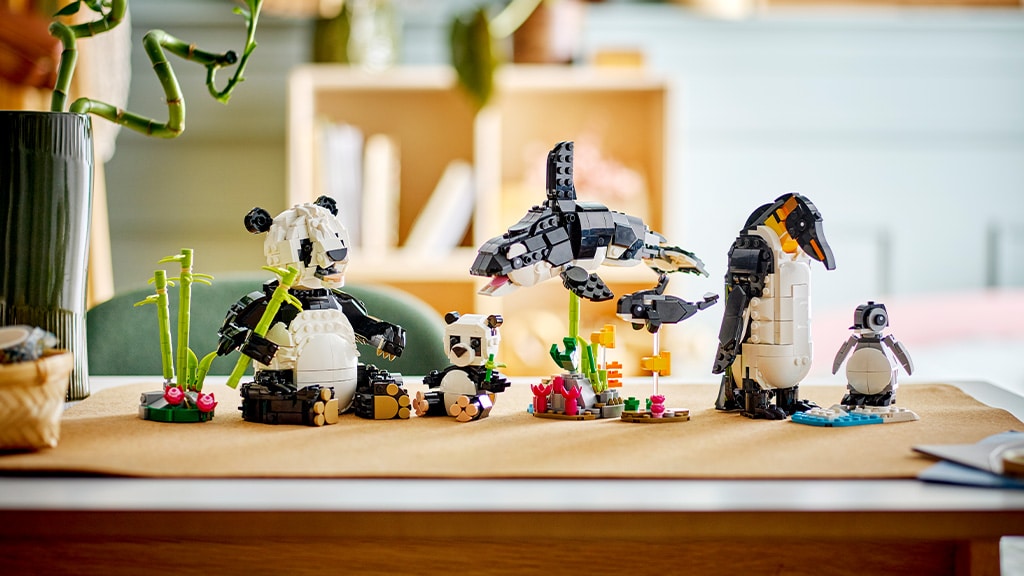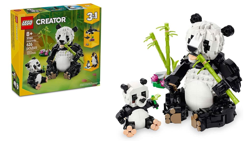 Von Pandas über Pinguine bis hin zu Orcas bringt dieses LEGO Creator 3-in-1 Wildtiere: Panda-Familie Set die Wildtiere ins Spiel. Dieses Set besteht aus 626 Teilen, sodass Kinder ab 8 Jahren den Panda mit seinem Jungen, den Pinguin mit seinem Küken oder den Orca mit seinem Kalb aus denselben Bausteinen bauen können. Die Kinder können die Tierfamilien nach Belieben gestalten – der Orca kann seinen Körper und seine Flossen bewegen; der Pinguin kann seinen Kopf, seine Flossen und Beine bewegen; und der Panda kann seine Pfoten, seinen Hals, seinen Mund und seinen Kopf bewegen. Das Set enthält einen kleinen Bambusbaum für die Panda-Familie, eine eisige Landebahn für das Pinguin-Küken und zwei transparente Ständer für die Orca-Familie.