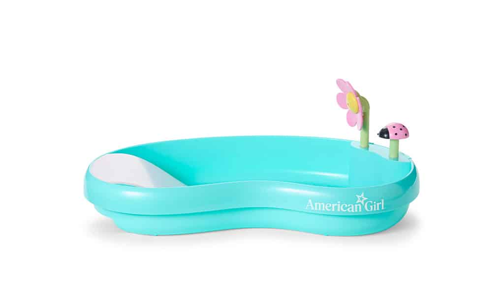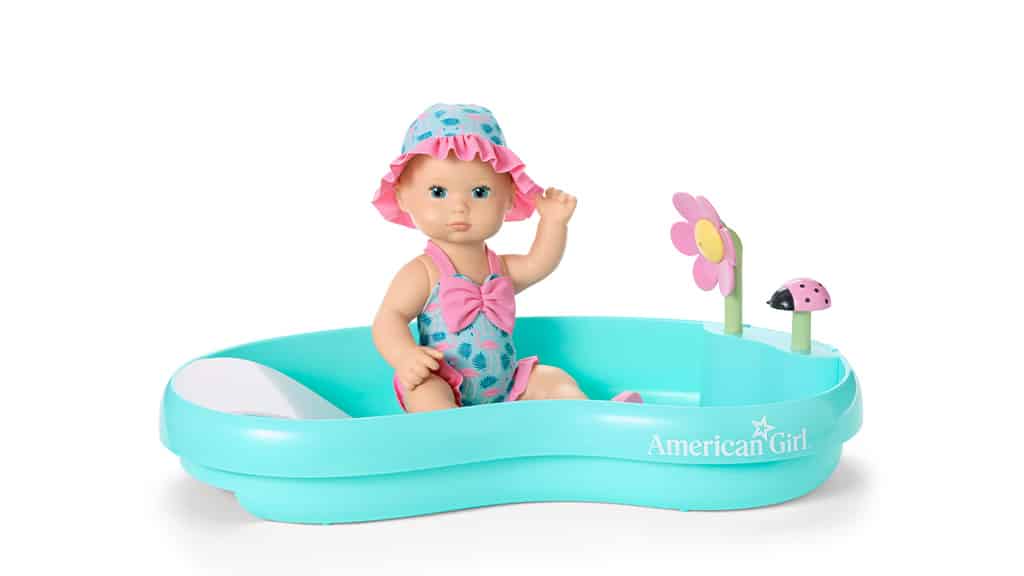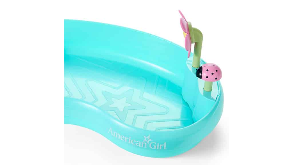 Baby-große Spielzeugpool, der perfekt zu den American Girl Bitty Baby Puppen passt. Familien können den Pool mit Wasser füllen, den Marienkäfer drücken, damit aus der Margerite Wasser spritzt, und die Puppen die eingebaute Rutsche hinunterrutschen lassen. Die Bitty Baby Puppen sind separat erhältlich. Dieser Spielzeugpool bietet Kindern eine großartige Möglichkeit, kreativ und fröhlich zu spielen, während sie ihre Fantasie und Feinmotorik entwickeln. Das bunte, fröhliche Design des Pools fesselt garantiert die Aufmerksamkeit der Kleinen und sorgt für stundenlangen Spaß.