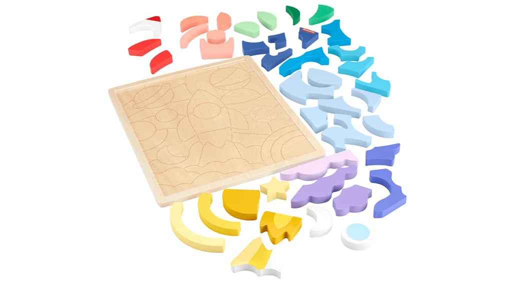 Die meisten Puzzles sind klein und haben ähnliche Formen, was für Kleinkinder eine Herausforderung darstellen kann. Dieses weltraumthemenbezogene Set beseitigt die Verwirrung beim Lösen von Puzzles mit einzigartig geformten Teilen, die groß genug für kleine Hände sind. Im Gegensatz zu klassischen Puzzles ermöglicht dieses Set auch freies Spielen, bei dem Kinder die Blöcke stapeln oder die Teile nach Farben sortieren können. Auch die Eltern können die pädagogischen Vorteile genießen, die Kinder aus diesem Puzzle ziehen können, einschließlich Feinmotorik, Problemlösung und Hand-Auge-Koordination.