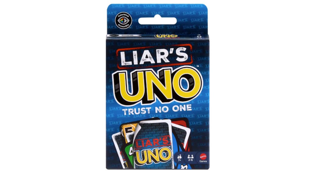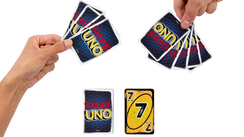 UNO -Fans werden diese neue Wendung des klassischen Kartenspiels lieben, bei dem Lügen frei erfunden werden dürfen und die Betrüger gewinnen! Eine „Lügenkarte“ muss verdeckt ausgespielt werden, danach sagt der Spieler, welche Karte er gelegt hat. Sagt er die Wahrheit oder blufft er nur? Wenn jemand ihn herausfordert und sich herausstellt, dass er gelogen hat, muss er eine Karte ziehen. Aber wenn es ihm gelingt, die anderen zu täuschen, dann müssen sie eine Karte ziehen! Dieses Spiel macht das bekannte UNO noch spannender und unterhaltsamer, denn in jeder Runde warten neue Überraschungen und viel Gelächter auf die Spieler.