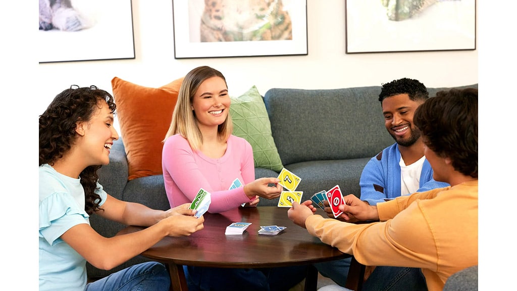 In dieser neu interpretierten Version des klassischen Kartenspiels spielen die Spieler in Zweierteams und ihr Ziel ist es, so schnell wie möglich ihre letzte Karte loszuwerden. Dazu müssen die Spieler entweder die Farbe oder die Zahl der Karte auf ihrer Hand mit der obersten Karte des Ablagestapels abgleichen. Diese Version enthält auch Übergabesymbol-Karten, mit deren Hilfe die Teammitglieder Karten untereinander tauschen können, was das Spiel noch spannender und taktischer macht.Sobald ein oder beide Teammitglieder ihre letzte Karte erreichen, muss mindestens einer von ihnen laut „UNO“ sagen, sonst erhalten sie zur Strafe weitere Karten. Wenn ein Teammitglied alle seine Karten aufgebraucht hat, können die übrigen Karten unter den Teamkollegen aufgeteilt werden, so dass das Spiel weitergeht. Wie beim klassischen UNO gewinnt das Team, das als erstes alle seine Karten loswird.
