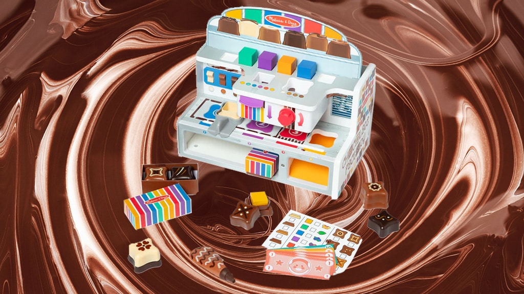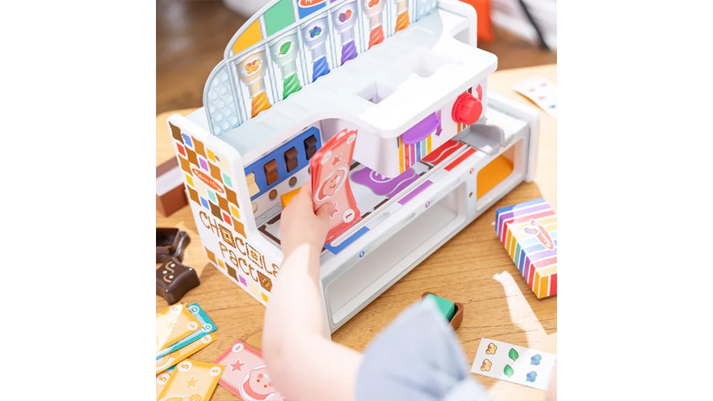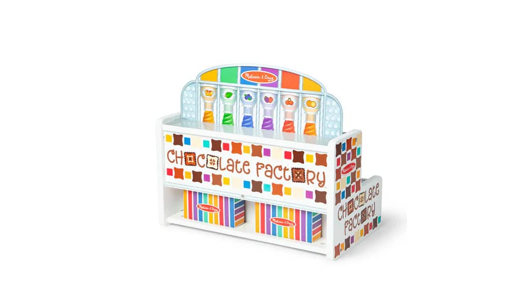 Mit diesem Rollenspiel-Set können Kinder ihre eigene Süßwarenfabrik leiten. Während die Süßigkeiten das Fließband entlanglaufen, können die Kinder Schalter umlegen, um die Geschmacksrichtungen anzuzeigen, bunte Holzfüllungen in die Leckereien einfügen und sie mit Aufklebern dekorieren.