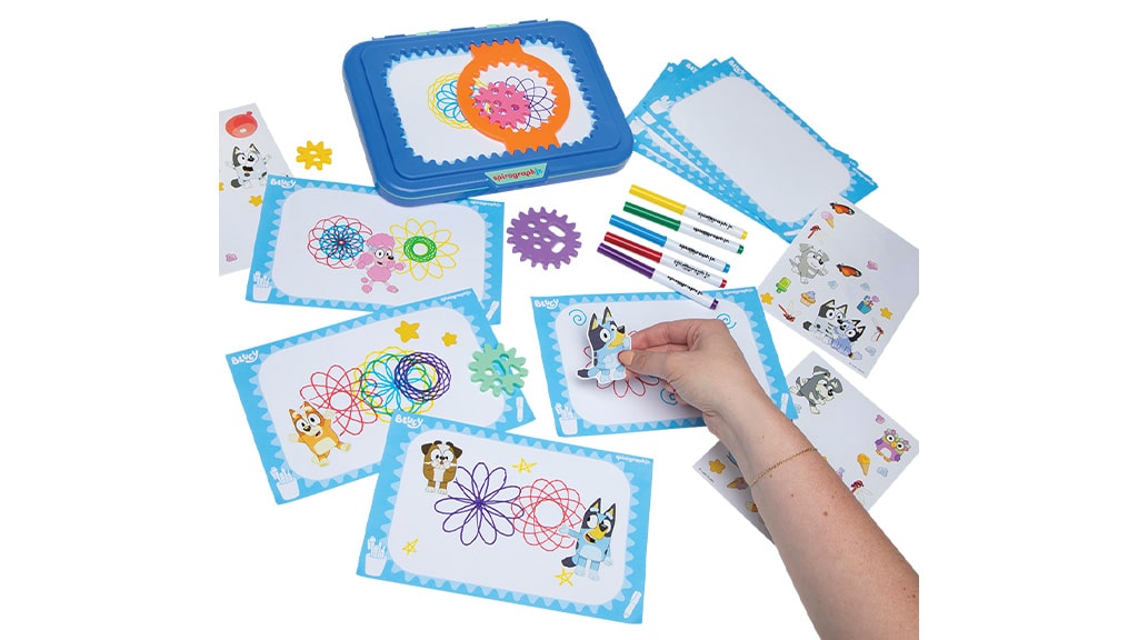 Eltern können ihre Kinder in die Welt der Retro-Unterhaltung einführen mit einem Set, das die Charaktere ihrer Lieblingsvorschulserie enthält. Diese Version des Spirograph Jr. von PlayMonster enthält alles, was für die Erstellung von Bluey-Themen-Spiralkunst benötigt wird. Kleine Künstler können Meisterwerke mit dem Designertisch, Designpapier, vier Zahnrädern, fünf Filzstiften und drei Bluey-Aufkleberbögen erstellen. Zuerst heben die Kinder den Rahmen an und legen ein Blatt Papier zwischen die Eckmarkierungen. Dann, nachdem sie den Zahnradkranz in den Rahmen eingesetzt haben, wählen sie den gewünschten Filzstift und das Zahnrad aus, um unterhaltsame Muster zu erstellen.