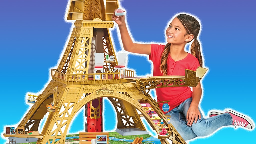 Dieses 4 Fuß hohe Turm-Spielset von Playmates Toys bietet dreistufiges Spiel: einen unteren Picknickplatz, ein elegantes Restaurant auf der mittleren Ebene sowie einen Kwami-Speicher und eine Seilrutsche auf der obersten Ebene. Die unteren und mittleren Bereiche sind durch einen handbetriebenen Aufzug verbunden, und die Beine des Turms verbergen Überraschungsläden, die die Kinder öffnen und mit ihren Puppen nutzen können. Mit diesem Spielset können Kinder ihre eigenen Geschichten im Miraculous Ladybug-Universum erschaffen!