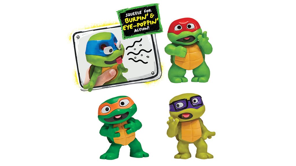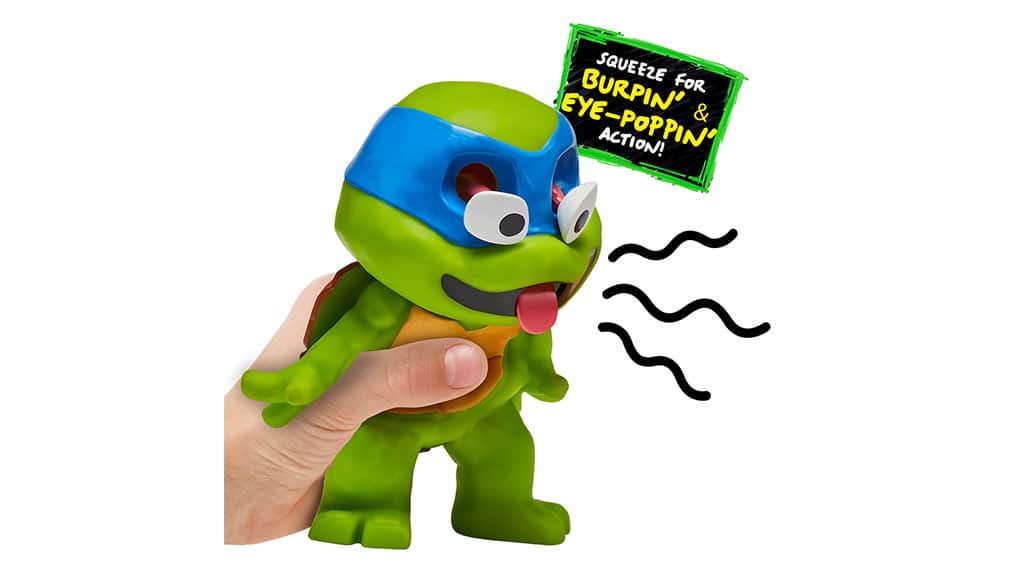 Die neuesten Sammelfiguren von Playmates Toys tauschen jetzt die Kraft der Schildkröten gegen die Kraft des Rülpsens! Die „Teenage Mutant Ninja Turtles Geschichten: Rülpsende Schildkrötenbabys“ sind Figuren aus weichem Kunststoff, die mit hervortretenden Augen und herausschnellender Zunge die Kinder unterhalten. Dieses lustige, rülpsende Team – Leonardo, Raphael, Donatello und Michelangelo – gibt furzähnliche Geräusche von sich, wenn die Kinder sie fest zusammendrücken. Diese Figuren sind nicht nur unterhaltsam, sondern bieten auch ein kreatives Spielerlebnis, während die Kinder mit ihren Lieblingshelden spielen. Jedes Mitglied der Sammlung stellt einen einzigartigen, lustigen Charakter dar, sodass die Kinder mit Freude die besonderen Geräusche und Bewegungen entdecken können, die diese Figuren machen.