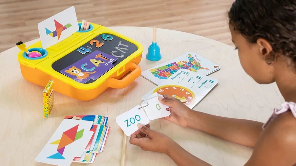 Auf der Außenseite des tragbaren Schultisches befindet sich eine magnetische Tafel, zwei eingebaute Werkzeughalterbecher und ein Ständer für Lernkarten. Die Kinder öffnen ihn und finden innen eine magnetische weiße Tafel, zwei abgedeckte Aufbewahrungsfächer sowie viele Zubehörteile, darunter Kreide, magnetische Buchstaben und Zahlen, magnetische Tangram-Formen, Wortkarten, mathematische Karten und vieles mehr.