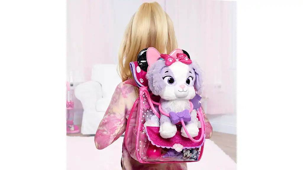 Dieses achtteilige Set enthält ein 11-Zoll interaktives Cream Puff Plüschtier und einen glitzernden Mode-Rucksack, in dem alle Werkzeuge zu finden sind, die Kinder benötigen, um Tierarzt zu spielen. Kinder können Cream Puffs Pfote drücken, um die Lichter, die Welpengeräusche und Minnies Ausdrücke zu aktivieren. Cream Puffs Nase leuchtet, wenn er Hilfe braucht.