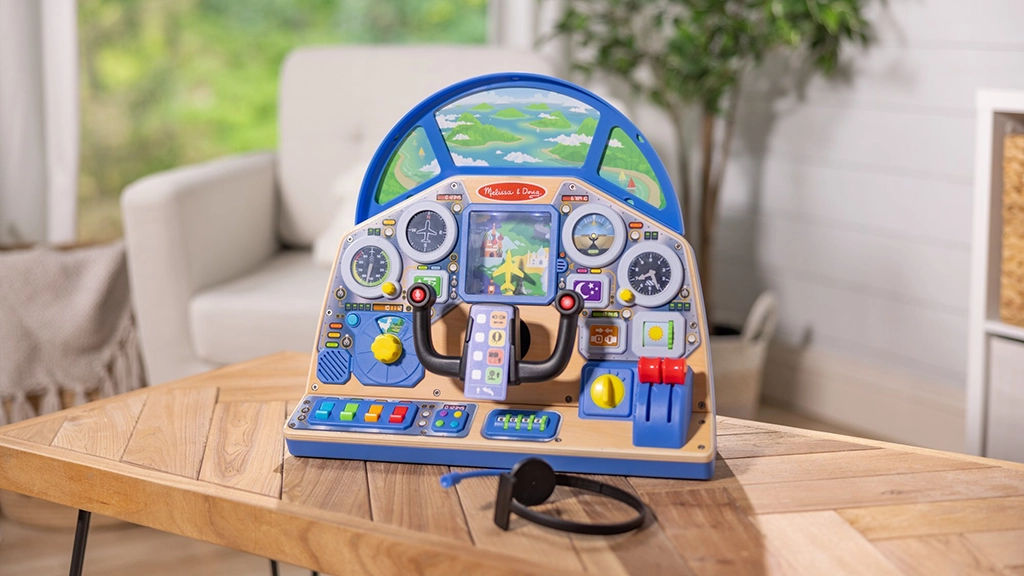 Angehende Piloten können sich mit diesem interaktiven Armaturenbrett auf den Start vorbereiten, das Lichter, Knöpfe, Klangwiedergabe, einen vierstufigen Gashebel und vieles mehr enthält. Die Kinder können das Lenkrad drehen, um ein Mini-Flugzeug auf einem scrollbaren Display zu bewegen.