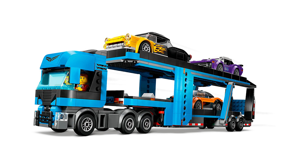 Dieses LEGO City Set mit 998 Teilen enthält einen zweistöckigen Transport-LKW mit Anhänger, drei anpassbare Autos und vier Minifiguren. Der Transport-LKW ist realistisch und kann alle drei Autos gleichzeitig transportieren. Die Autos können durch den Austausch von Teilen und das Mischen von Farben angepasst werden. Kinder können sogar die Fahrerkabine kippen, um den Motor zu sehen.