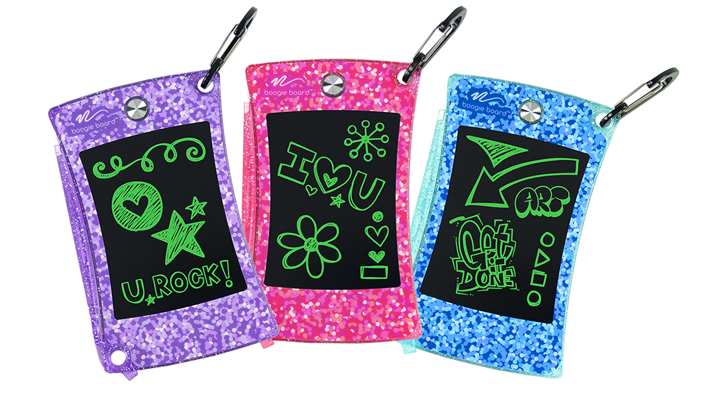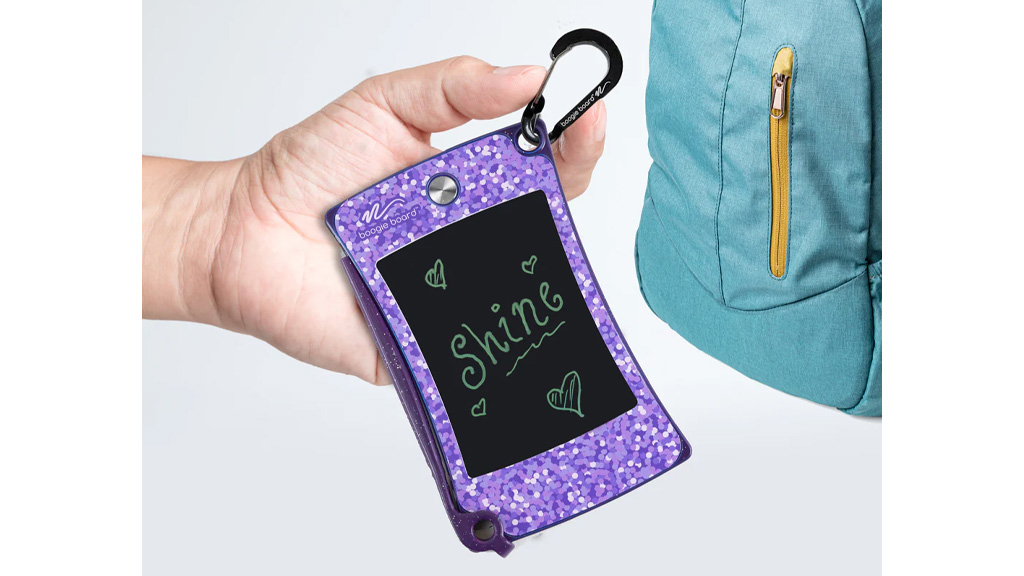 Die Jot Pocket Schreibtafel ist eine dünne, leichte, wiederverwendbare Tafel. Kinder können mit dem Stylus auf die schwarze Oberfläche zeichnen und schreiben und dann den 4,5-Zoll-Bildschirm durch Drücken eines silbernen Knopfes löschen. Mit dem mitgelieferten Karabiner können die Kinder die Tafel an ihrem Rucksack, der Tasche eines Elternteils oder einer Wickeltasche befestigen. Außerdem können sie das Spielzeug mit der Stütze aufstellen.
