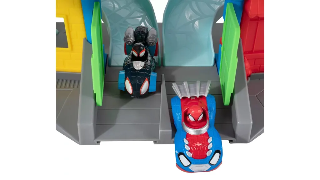 Es stellt verschiedene Charaktere aus der Show vor, wie zum Beispiel Doc Oct, Green Goblin und Rhino — sowie neun Actionzonen, die von den Charakteren inspiriert sind. Die Fahrzeuge rasen über zwei Strecken durch das Spinnennetzschwingen, den Brückeneinsturz, das Zerschmettern von Werbetafeln, die Falltür, den Kürbiskreuzungskollision, den Turmdrehschutz und den Geschwindigkeitsstarter, bevor sie durch die Türen brechen.