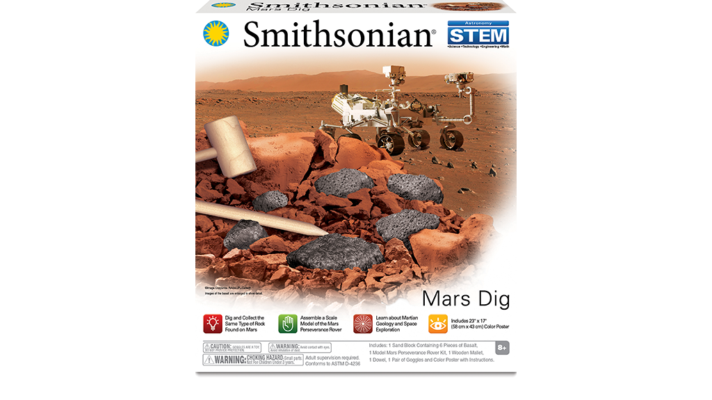 Das Smithsonian Mars Dig von NSI International enthält alle notwendigen Werkzeuge, mit denen Kinder die Gesteine entdecken können, die auch auf dem Mars zu finden sind. Kinder ab 8 Jahren können mit einem Meißel Sand aus einem Block entfernen, um sechs Stück Basalt zu entdecken. Außerdem können sie ihr eigenes maßstabsgetreues Modell des Perseverance Rovers zusammenbauen, der Gesteinsproben gesammelt hat, um sie zur Erde zurückzubringen und zu untersuchen. Das Set enthält auch ein Poster, auf dessen einer Seite viele Informationen und auf der anderen Seite Anweisungen zu finden sind.Die Kinder lernen zahlreiche STEAM-Konzepte, wie Geologie, Raumfahrt, Astronomie und vieles mehr. Sie können über den Perseverance Rover und die Bedeutung seiner Mission lesen, während sie auf praktische und erfahrungsbasierte Weise die auf dem Mars vorhandenen Gesteine und Sedimente kennenlernen. Der Zusammenbau des Rovers ist einfach und schnell – die Teile klicken einfach an ihren Platz, und die Kinder können die Komponenten studieren und ihre Funktionen kennenlernen. Nachdem die „wissenschaftliche Forschung“ (Gesteinsgrabung) abgeschlossen ist, können die Kinder ihre neuen Gesteine zu ihrer Sammlung hinzufügen!