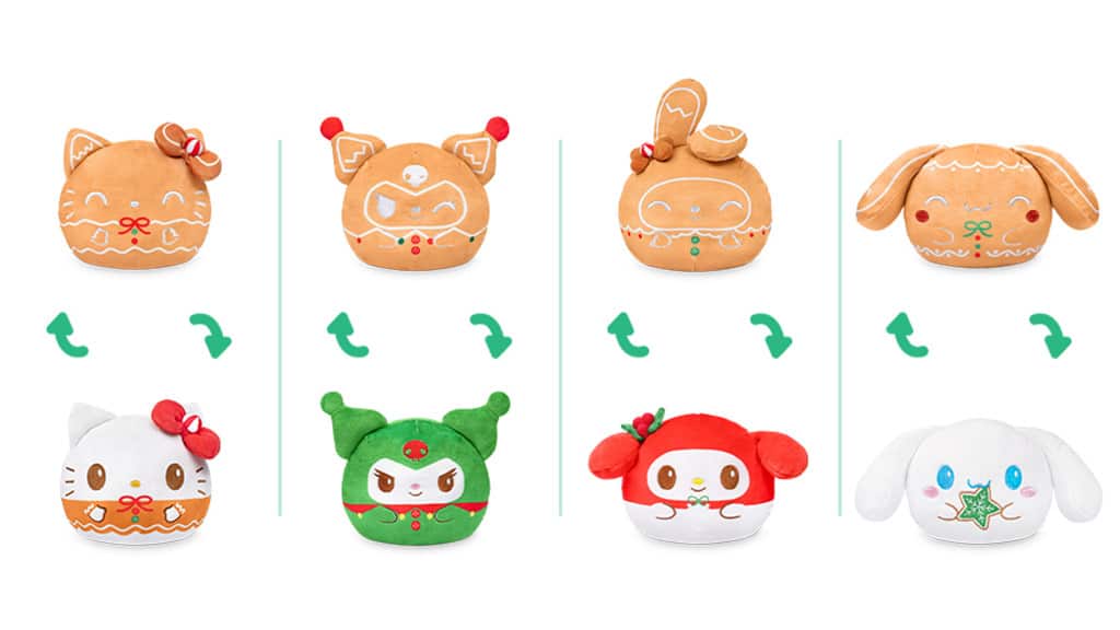 Diese Kollektion enthält die folgenden Charaktere: Hello Kitty, My Melody, Kuromi und Cinnamoroll. Die Plüschfiguren sind wendbar, auf der einen Seite sind die Charaktere in Lebkuchenform und auf der anderen Seite in festlich gekleideten Versionen zu finden. Diese besondere Kollektion ist ein perfektes Geschenk für Fans, da die Charaktere in zwei verschiedenen Erscheinungsformen genossen werden können. Die Plüschtiere sind aus weichem Material gefertigt, sodass sie nicht nur dekorativ, sondern auch angenehm zu berühren sind. Die festliche Stimmung wird durch das fröhliche und farbenfrohe Erscheinungsbild der Charaktere weiter verstärkt, was Menschen jeden Alters Freude bereiten kann.