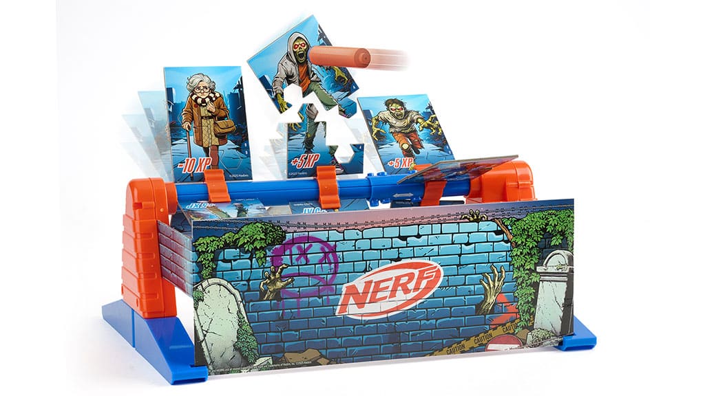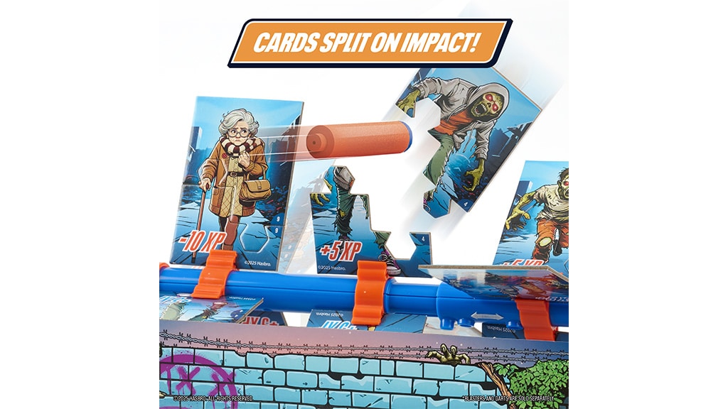 Kinder ab 8 Jahren oder älter platzieren die Zombie-Karten auf dem drehbaren Rahmen des NERF Zombie Strike und können dann zwischen drei Geschwindigkeitsstufen wählen: 15 Sekunden langsames Drehen, 30 Sekunden schnelles Drehen oder 20 Sekunden mit wechselnder Geschwindigkeit – so hört der Spaß nie auf. Anschließend müssen sie mit NERF-Darts und Blastern auf die Zombie-Karten auf dem drehenden Rahmen zielen, die bei einem Treffer leicht auseinanderfallen. Das Spiel ist dadurch einfach, die Punktzahlen sind schnell nachvollziehbar und das Spiel kann leicht neu gestartet werden.